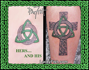 Celtic cross tattoo on a person's arm with decorative green triangle and 'Lucky Fish' branding.