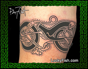 Celtic knot tattoo on a person's arm with Celtic cats from the Book of Kells and 'LuckyFish.com' branding.