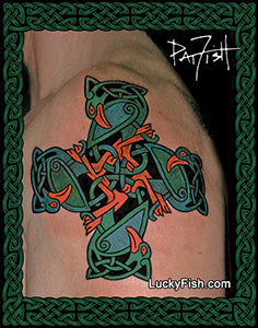 Pat Fish has specialized in Celtic tattooing since 1984, and has designed each original image in this collection specifically to be an effective tattoo. Many of the designs are inspired by her research into the illuminated manuscripts and carved standing stones in Ireland, Scotland, and the rest of the British Isles. Patterns have been chosen for their strong symbolism, aesthetic appeal, and suitability for the tattoo medium. You can learn more about Pat Fish HERE. Her studio's main website is LuckyFish.com (you are currently browsing LuckyFishArt.com).