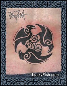 The ancient symbol of the goddess, representing the connection between mind, body and spirit. Returning to learn through experience, time and time again. Ravens in threes have long symbolized the gathering together of wisdom for a purpose.