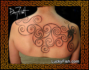Pat Fish has specialized in Celtic tattooing since 1984, and has designed each original image in this collection specifically to be an effective tattoo. Many of the designs are inspired by her research into the illuminated manuscripts and carved standing stones in Ireland, Scotland, and the rest of the British Isles. Patterns have been chosen for their strong symbolism, aesthetic appeal, and suitability for the tattoo medium. You can learn more about Pat Fish HERE. Her studio's main website is LuckyFish.com (you are currently browsing LuckyFishArt.com).