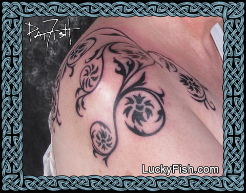 The designs offered here are shown in photographs to give you a clear idea of what they will look like as your tattoo. ALL of them have been installed by the artist, Pat Fish, and were custom designed by her specifically to be effective tattoos. You can work with your artist to make changes in rendering that will personalize your unique version of the pattern.