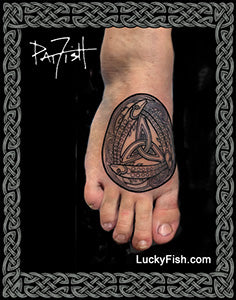 Pat Fish has specialized in Celtic tattooing since 1984, and has designed each original image in this collection specifically to be an effective tattoo. Many of the designs are inspired by her research into the illuminated manuscripts and carved standing stones in Ireland, Scotland, and the rest of the British Isles. Patterns have been chosen for their strong symbolism, aesthetic appeal, and suitability for the tattoo medium. You can learn more about Pat Fish HERE. Her studio's main website is LuckyFish.com (you are currently browsing LuckyFishArt.com).
